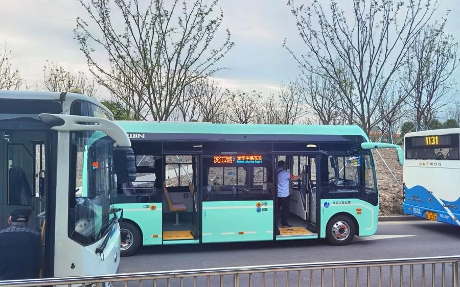 在通耀路耀龙路的终点,滨江2路的“婴儿车”混合在1131路、610路、浦东97路等一堆大型车中,非常显眼。后面是建设中的“双子山”。(秦岭拍摄)