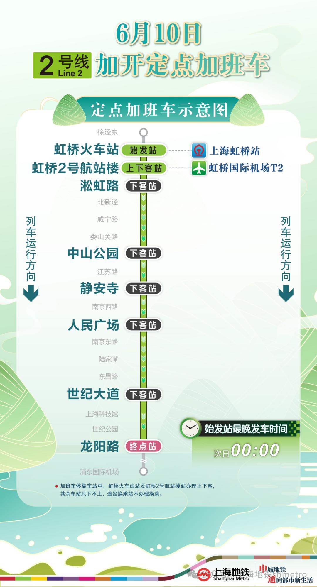 2号线虹桥火车站向龙阳路站方向加班,虹桥火车站站、虹桥2号航站站、淞虹路站、中山公园站、静安寺站、人民广场站、世纪大道站、龙阳路站(终到站)等车站停车。停靠车站时,虹桥火车站(始发站)和虹桥2号航站楼站上下乘客,但其他车站不能下车,不能通过换乘站转移。