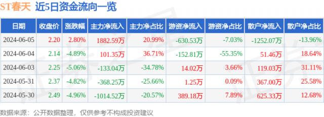 6 月 5 在日资金流入数据方面,主要资金净流入 1882.59 一万元左右,约占成交额 游资资金净流出20.99% 630.53 一万元左右,约占成交额 散户资金净流出7.03% 1252.07 一万元左右,约占成交额 13.96%。