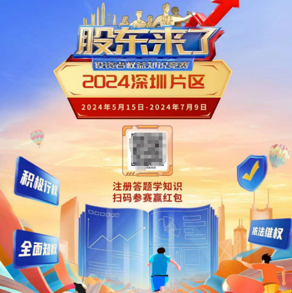 今年5月15日,《股东来了》(2024)投资者权益知识大赛正式启动,由上海、江苏、西藏、深圳四地证监局联合举办。