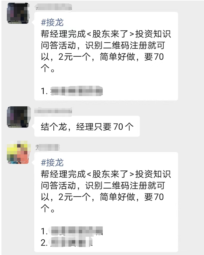 根据头条记者的进一步调查,在最近的一些微信群中,一些“黄牛”会向群友发送邀请注册“股东来了”活动的广告,奖励通常是一个人注册一次。~3元。
