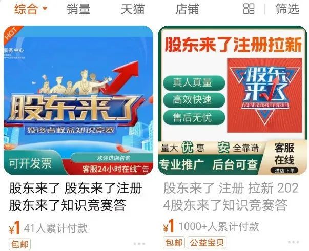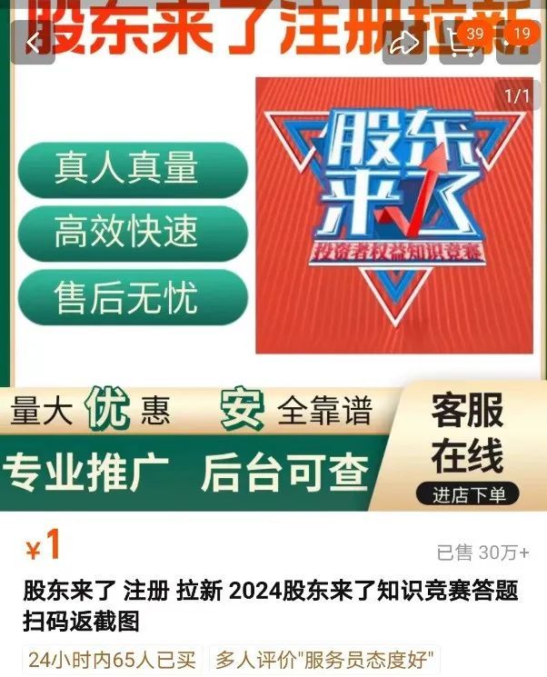 日前,记者查询了一些网购平台,能找到大量销售《股东来了》竞赛注册拉新指标的店铺,即由店铺代券商完成注册任务指标。一些商店还在宣传广告中突出了“真人真量,专业团队,高效快捷,售后无忧”等卖点。
