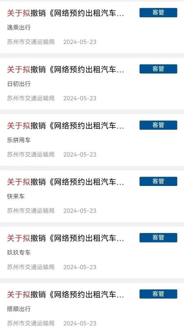 5月17日,苏州发布公告,拟撤销7家网络汽车平台的经营资质,如逸乘、日初出行、乐拼车、快来车、九九专车等。这些网络汽车平台在执法检查中发现,没有线下服务能力。
