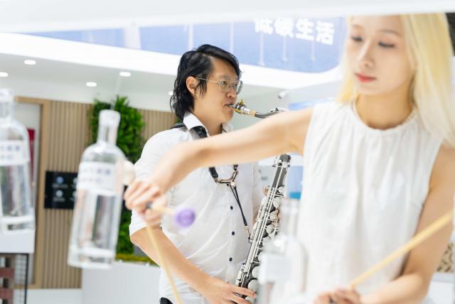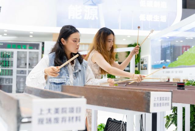 展台中央作为活动亮点之一,布置了一套特殊的艺术装置——用于展台中央。 480 研究开发高性能材料实验用钢材和地基沙子瓶,以及涂药。 / 永发净化水瓶等回收物品直接设计了一套敲击乐器,由上实员工、建筑居民和年轻爵士音乐家共同参与闪光表演,倡导废弃材料的减少和再利用。