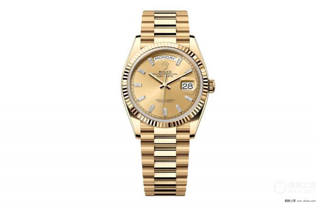 这个搭配是劳力士著名的元首型。(President)表带 ,18K 金色材料,三格弧形链节,可靠,舒适,刺眼。