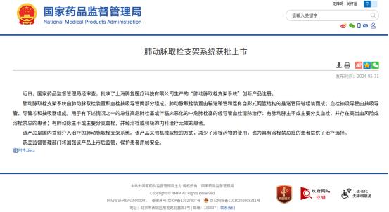 记者从区经委获悉,闵行公司上海腾复医疗科技有限公司制造的“肺动脉取栓支架系统”创新产品已通过国家医药产品管理局审查,产品注册已完成。该产品是一种技术领先的肺动脉取栓支架系统,采用机械取栓的方法,减少了溶栓药物的应用,为溶栓禁忌症患者提供了新的治疗选择,带来了好消息。