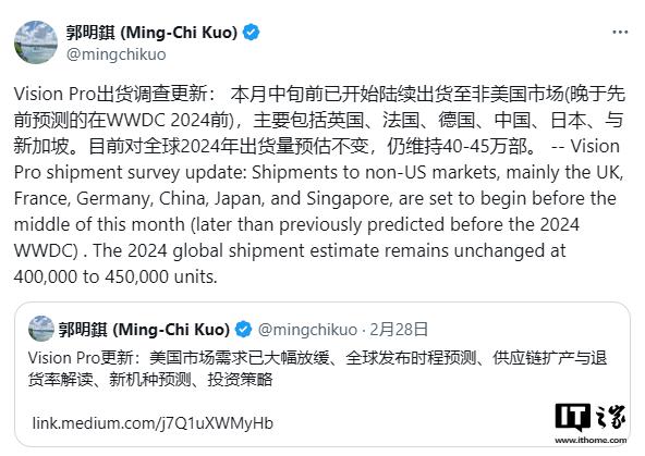 另外,郭明邈现在是对的 Vision Pro 全球 2024 年度出货量估计不变,仍保持不变, 40-45 万部。