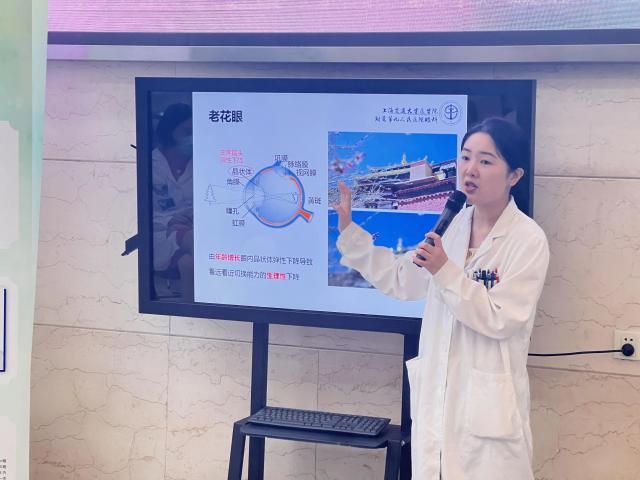 今年“爱眼日”的主题是“关注普通眼部健康”。活动开始时,上海交通大学医学院附属第九人民医院眼科的苏蕴博士为居民们做了一个生动详细的“视力模糊,看不清楚,有哪些眼病在起作用?”眼部健康讲座。在讲座中,她阐述了眼部保健知识和常见的眼病预防方法,引起了现场居民的高度重视。