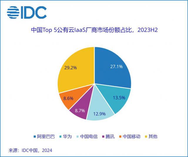 在 IDC 中国公有云服务市场(2023年)发布 下半年)跟踪报告中也可以清楚地看到这一变化,数据显示,2023 下半年 IaaS 在市场上,阿里巴巴云和腾讯云的市场份额持续下降,而华为云、天翼云和移动云的市场份额呈稳步增长趋势。其中,天翼云同比增长 1.1%。移动云市场份额增长最为明显,同比增长 2.3%。三大运营商 2023 年度云业务收入总体达到 2315 一亿元,正在迅速追逐云巨头阿里云。在这些人中,天翼云的利润与阿里云非常接近。