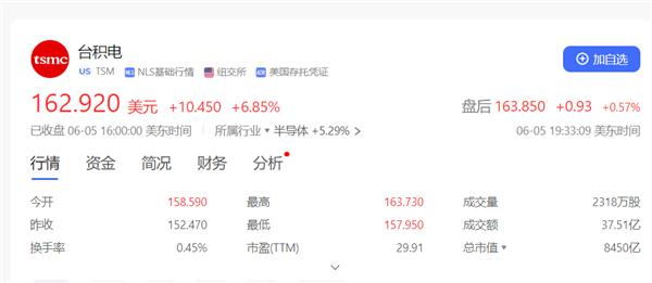 截至发稿时,台积电美股股价报告 162.92 美金 / 股票,涨幅超过 总市值达到6.8% 8450 亿美元,创造了新的历史高点。