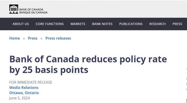 当地时间 6 月 5 日前,加拿大央行宣布将政策利率从 5% 降到 4.75%。根据路透社的报道,这是加拿大四年来第一次降息,也是七国集团 ( G7 ) 中国第一个降息的国家。外界普遍预计,这一举动将减轻高负债消费者的压力,但这表明进一步降息将取决于数据。