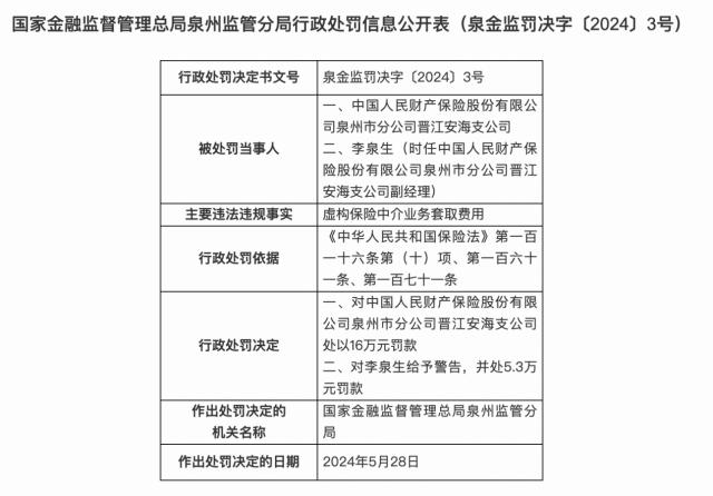 由于虚构保险中介业务骗取费用,中国财险泉州市子公司晋江安海支公司被处以 16 万元罚款。与此同时,李泉生(时任中国财险泉州子公司晋江安海支公司副经理)被警告并处以处罚。 5.3 万元罚款。