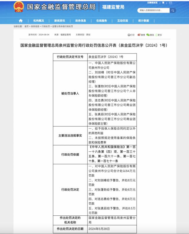 在这些公司中,中国财险泉州市子公司被共同处以 64 万元罚款,由于给予被保险人保险合同规定以外的其他利益,未按规定使用备案的保险条款和保险费率。与此同时,刘剑峰(当前中国财险晋江分公司副总经理)受到警告,并处以警告。 8 罚款万元;张蓬勃 ( 时任中国财险晋江市子公司个人非车险部主管部门。 ) 被警告,并处 8 罚款万元;连志勇 ( 当时,中国财险晋江市子公司商业团队保险经理)被警告,并处 8 罚款万元;张真茹 ( 时任中国财险晋江市子公司商业团队保险部主管)被警告,并处以警告。 8.5 万元罚款。
