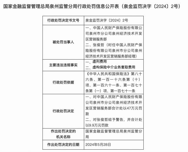 泉州市中国财险子公司泉州经济技术开发区因营销服务部虚列费用、虚构保险中介业务骗取费用被总处罚。 47 罚款1万元。同时,张俊哲(当前中国财险泉州子公司泉州经济技术开发区营销服务部主管)被警告,并被总处罚。 9.9 万元罚款。