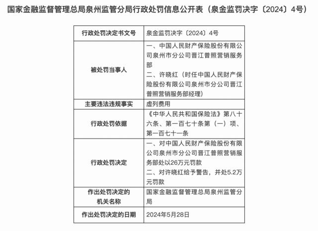 晋江普照市中国财险泉州市子公司营销服务部因虚列费用被处以。 26 罚款1万元。许晓红(时任中国财险泉州子公司晋江普照营销服务部主管)被警告并处以处罚。 5.2 万元罚款。