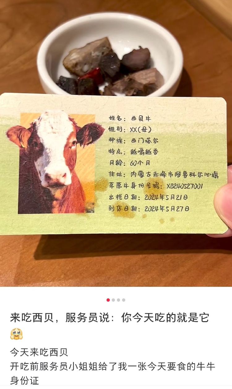 这位网友在帖子中描述说,5月31日,他去西贝筱面村吃饭。吃饭前,服务员给了他们一张今天要吃的牛的“身份证”,说那天这头牛刚到店里,大家吃的肉都来自它。并且告诉他们,每天都是新牛,吃不完的牛肉会做成牛肉酱。