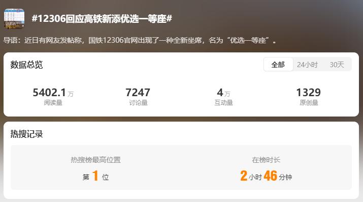 最近,有网友发帖称,12306推出了一个名为“首选一等座”的全新座位。微博热搜榜上有相关话题排名第一。