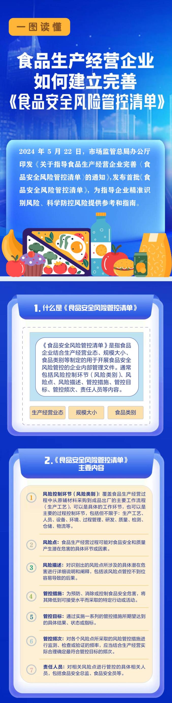 本次发布的食品安全风险控制清单为食品行业精准防控风险提供了参考和指导。公司可以根据业务形式、规模、食品类别等进行食品安全风险评估。,找到确定风险点,科学制定管理措施,及时调整管控频率,明确责任人员,建立符合企业实际情况的《食品安全风险控制清单》,将食品安全风险管理规范纳入当前管理体系,嵌入日常管理。严格控制食品安全风险,确保食品安全。