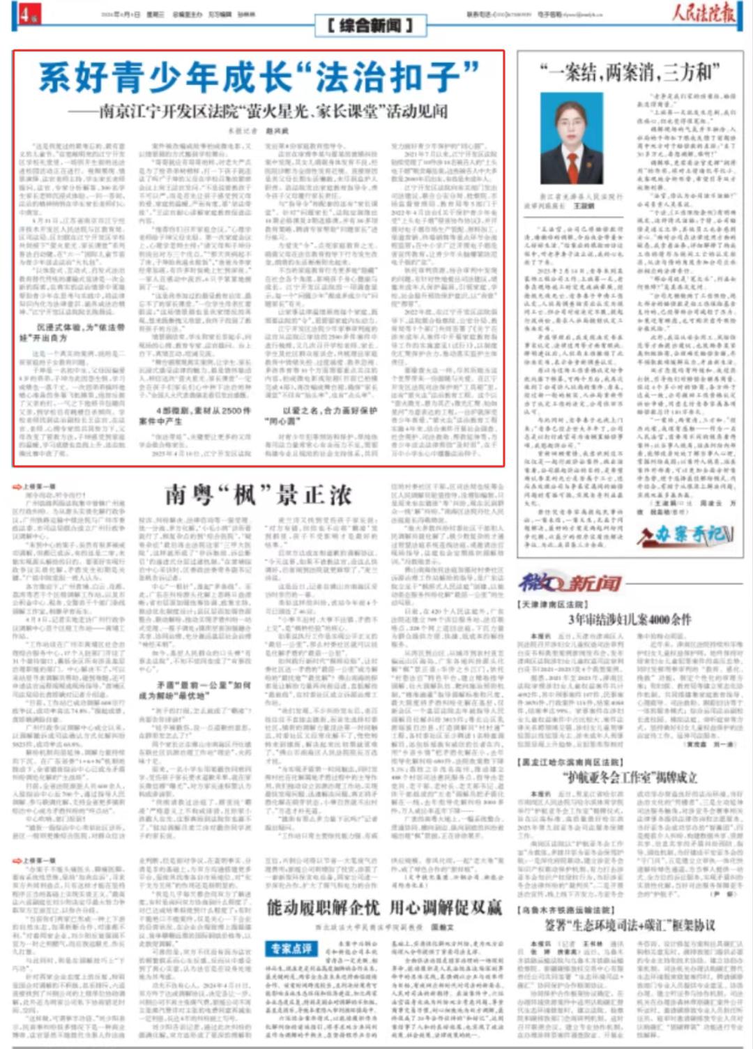 要像萤火虫一样,尽最大努力给这个世界带来温暖和关怀。“萤火虫”法治教育工程也是江宁开发区法院司法保护的“工具箱”。这一工程以“萤火虫微芒,愿为其芒;微芒聚集,灿如星辰”为意,一出炉就深受青少年的喜爱。四年来,“萤火虫”法治教育项目结合案件进行了社会调查、社会观护、司法救助、教学延伸等。,并将法律帮助“及时雨”送给青少年,在数百万中小学生心中播种法治种子。