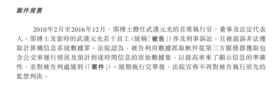招股书显示,根据当时的判决,2015年11月至2016年5月,时任元光公司法定代表人邵凌霜及技术主管陈邈在中国市场上的用户数量和信息查询准确性,以提高元光公司开发的智能公交APP,确保公司运营更好,由邵凌霜指示,利用网络爬虫软件,指示公司员工刘江红、刘坤朋、张翔在谷米公司服务器中获得实时动态,平均每天300万至400万条。