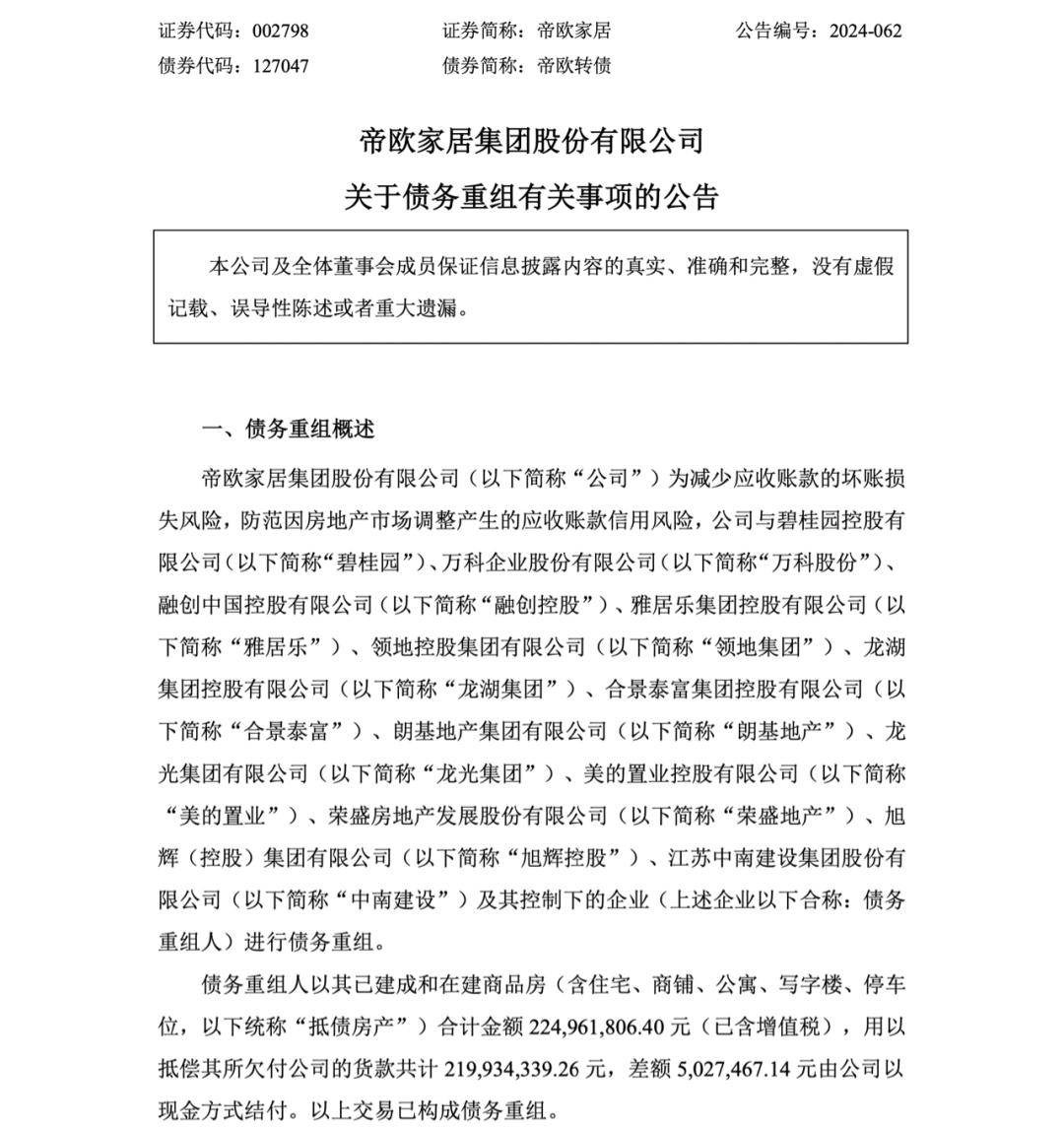 6月1日,帝欧家居集团有限公司(以下简称帝欧家居)发布公告,称与碧桂园、万科股权、融创控股、雅居乐等13家房地产公司进行债务重组。这些房地产企业约支付2.20亿元,因为他们已经建成并建造了新的商品房。