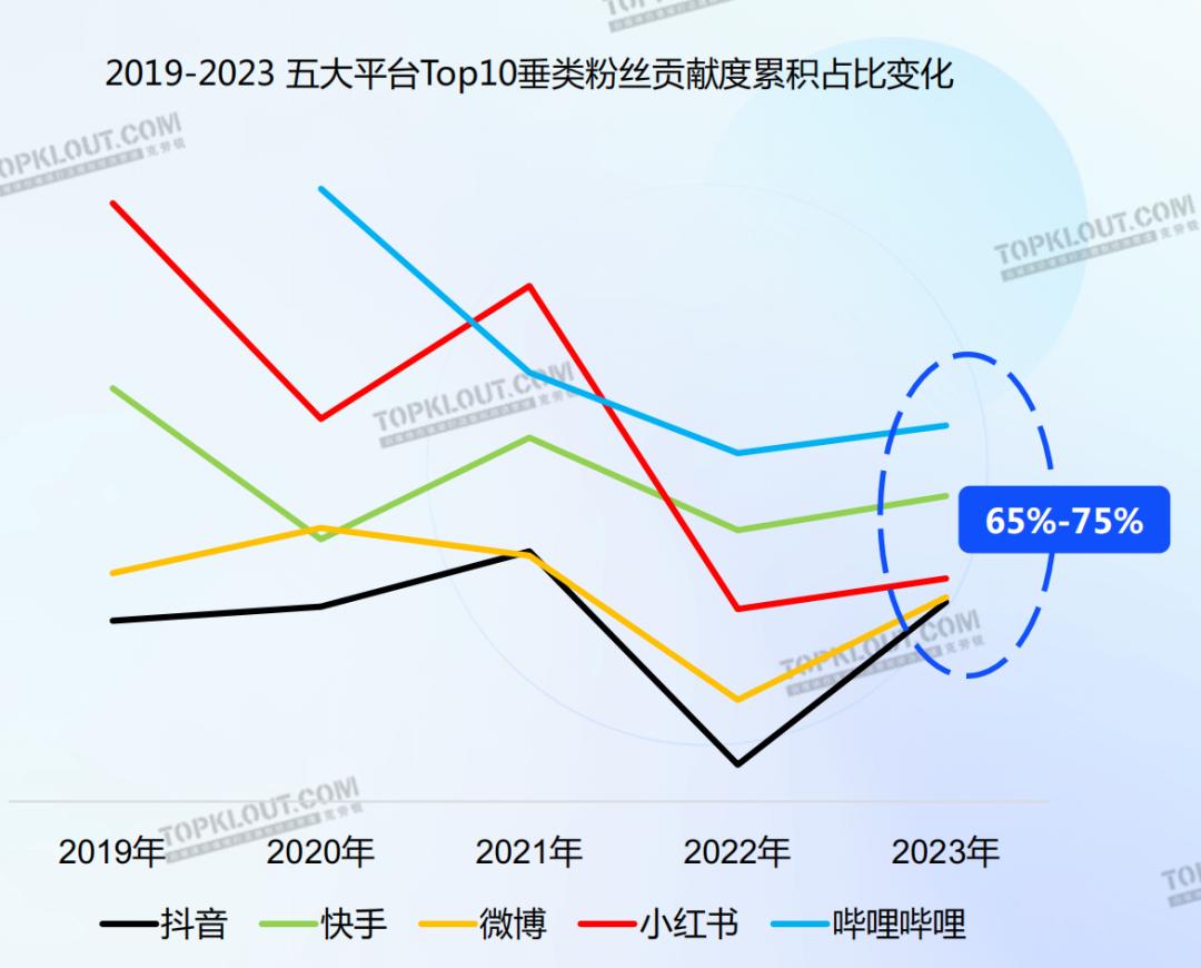 在过去的五年里,Top10垂直粉丝的贡献率略有波动。小红书、哔哩哔哩等渠道的粉丝集中度逐年下降,客户内容消费日益多样化。KOL粉丝在五大平台Top10类中的累计贡献率保持在65%-75%之间,即头部10个热门垂直类聚集了约70%的粉丝。