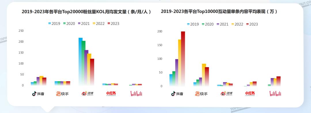在过去的一年里,除了Aautorapper平台之外,其他平台KOL的月平均发布量也比2022年有所下降。为了提高内容质量,提高粉丝粘性,获得持续的关注关系,促进商业化发展,KOL的创作从内容铺量转变为精细化运营。