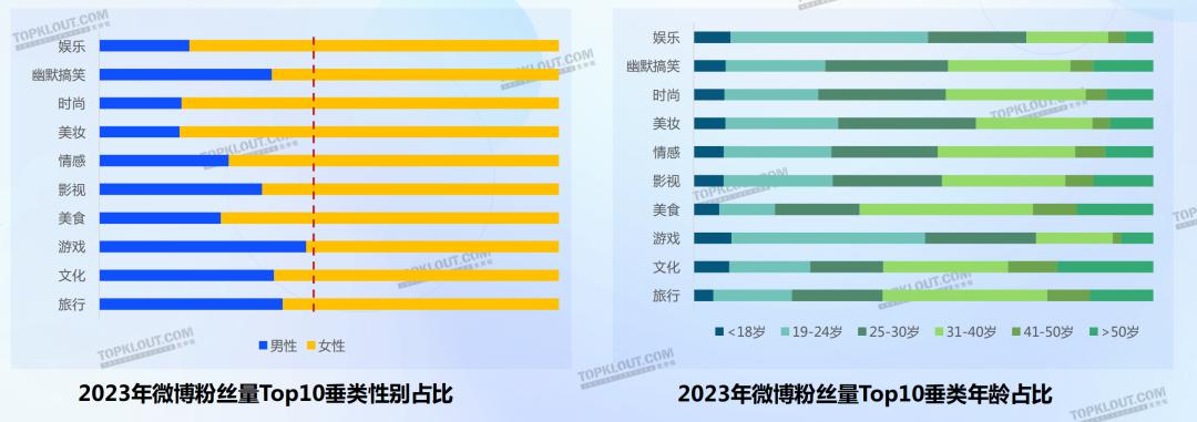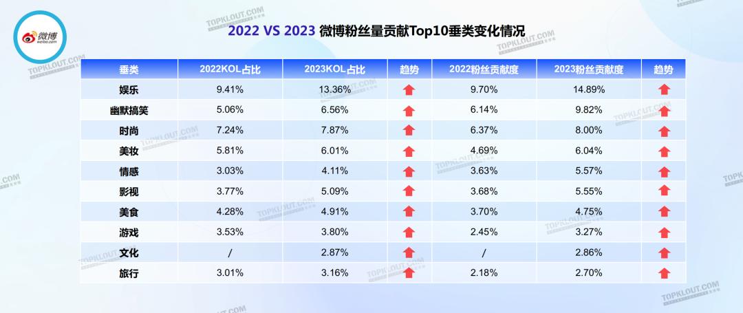 2023年微博Top10粉丝奉献垂类KOL数量与2022年相比,占全线增长,娱乐内容的增长最为明显。
