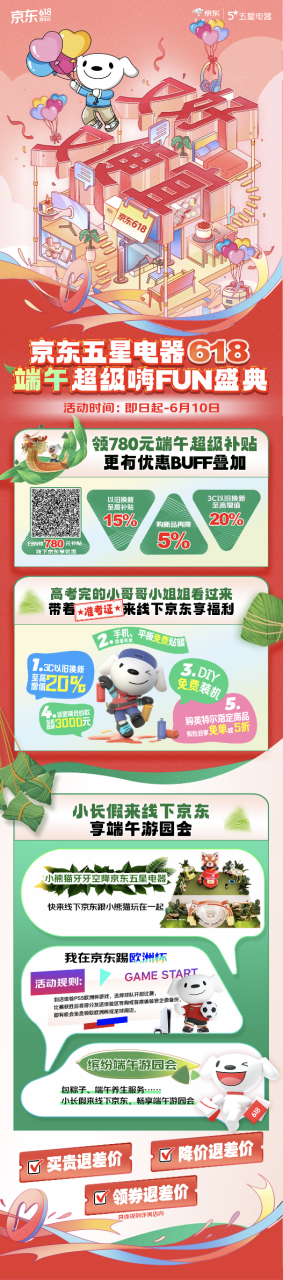 全国京东直营大店正在618大促销中,也以丰富多彩的活动迎接这一传统佳节。从现在开始到6月10日,京东直营店推出“端午节非常嗨FUN仪式”,不仅有“便宜好”的618消费体验,包括线上线下同价、综合价格保证服务,京东PLUS会员618独家780元非常补贴也可用于京东电器城旗舰店、京东MALL等京东直营店。同时,我们还参加了丰富多彩、有趣的端午节游园会:红山动物园的小熊猫牙空降店、包粽子、保健服务、欧洲杯挑战等有趣的体验。京东电器618遇上端午节小长假,不但买得便宜,而且玩得开心。