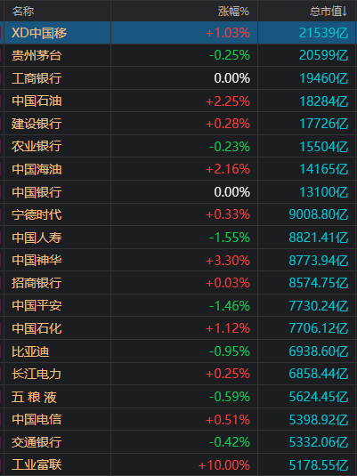 其中,中国石油板块涨幅超过3%,市值近1.9万亿元;中国神华涨幅超过3%,市值超过8800亿元;工业富联涨停,市值超过5000亿元。