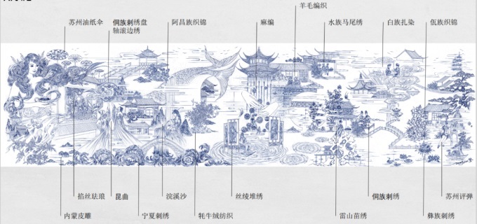 值得一提的是,店内还有一张由苏州香山帮传统木工技艺打造的非物质文化遗产展桌,展示了10多种农村女性非物质文化遗产工匠的手工艺品,直观地展示了不同地区的非物质文化特色。