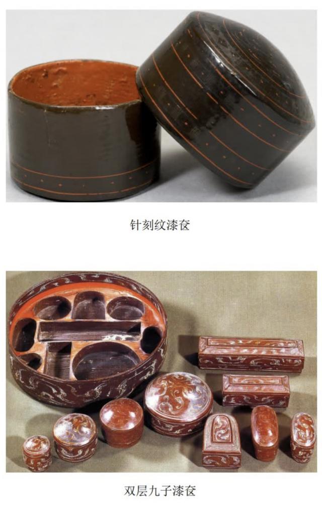 一个是两层九子,竹简称“九子曾检”。这件物品出土于一号墓,是辛追的化妆盒。