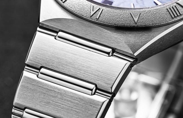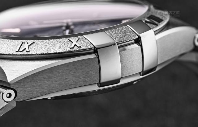 这种蓝色板材风格不是用陶瓷表圈,而是用五级钛金属作为基底,用激光腐蚀技术装饰浮雕罗马字母。从实拍来看,表圈包含了类似传统霜金工艺的坑纹效果。