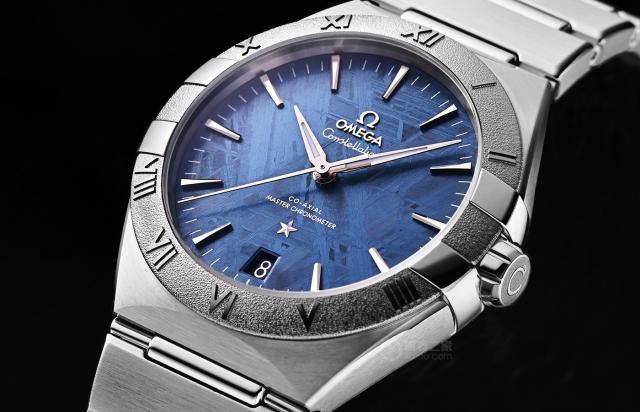 看完表壳表圈,我们来看看这款手表最大的特点设计,蓝色陨石盘的实物效果。虽然这种特殊的表盘在过去被各大品牌使用,但人们更注重自然之美,这只是表现出陨石线条的原色,但在欧米茄看来是如此。 PVD 以及电镀等色彩处理工艺,可以使陨石盘手表具有更出众、更有趣的视觉效果。