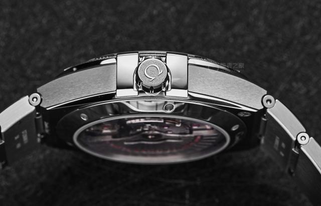41 mm表壳是刚做的。从装饰细节来看,外壳主要是大面积的拉丝装饰,表面是水平的。前壳与表耳处经典的半月形切面由两个不同方向的圆形拉丝组合而成。星座标志性的“爪子”是抛光的。