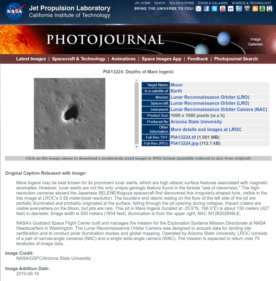 亚利桑那州立大学使用月球勘察轨道飞机相机进行网络爆炸。(LROC)捕捉。图为位于月球背面的智海(Mare Ingenii)日本SELENE/Kaguya航天器上的高分辨率照相机首次发现了上一个直径约130米的凹坑。照片中,凹坑左侧地面的巨石和碎渣部分被照亮。科学家推断,它们可能是月表的物质,从凹坑塌陷过程中的开口掉落。