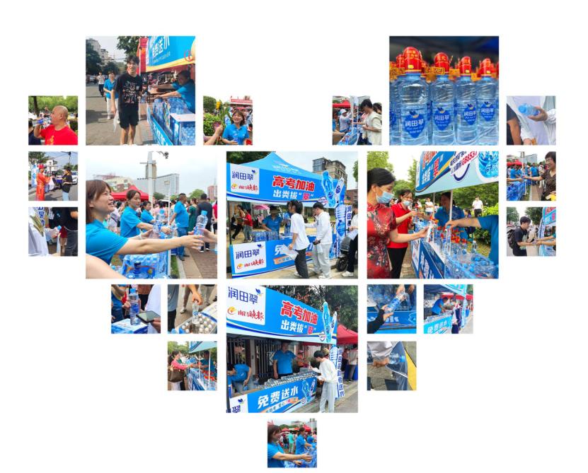 自2014年以来,江西知名饮用水品牌润田已连续10年开展高考爱心公益赠送活动。秉承“ 润田始终牢记社会责任,以人为本,大爱之道”的价值观。从“助考送水”到“高温送水”,润田用实际行动一次又一次地展现了公司的完整温度。