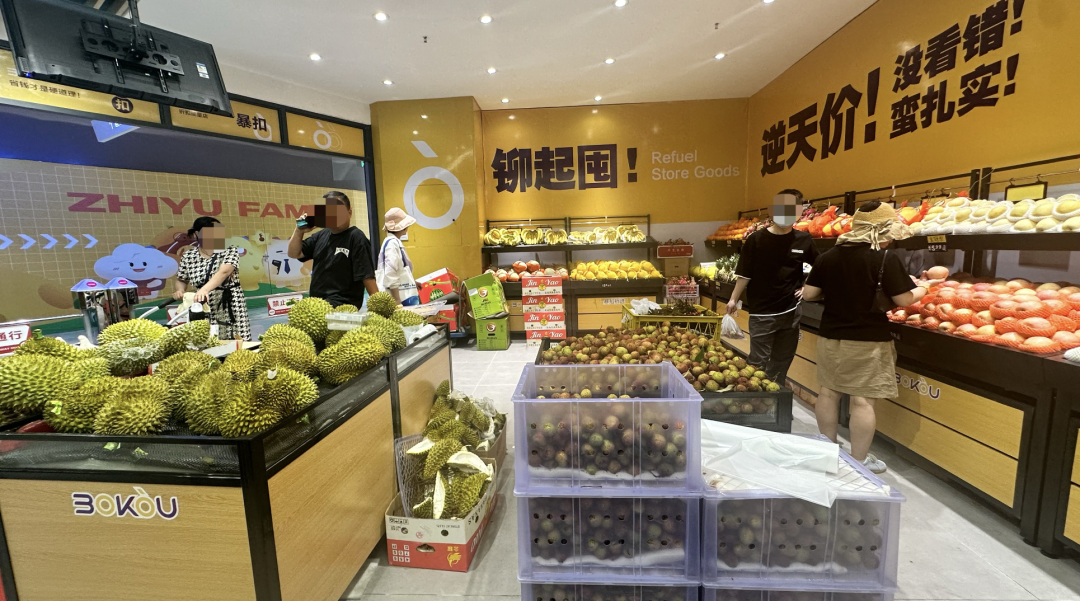 商店左侧是生鲜区,榴莲、荔技和西瓜在开业当天起着主要的引流作用,但这三种商品没有明确的价格标签,其中活动西瓜的价格为2.99元/斤,与百果园西瓜的正常价格相同。