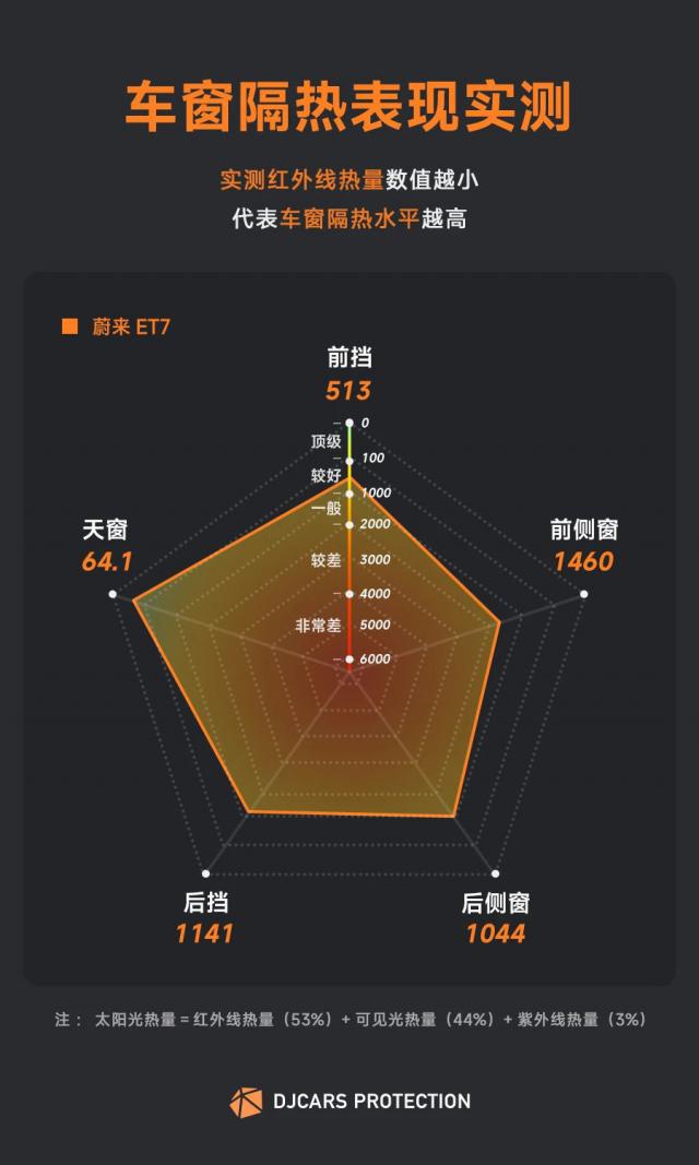蔚来是我们实际测量的 ET7 整车玻璃隔热体现如下: