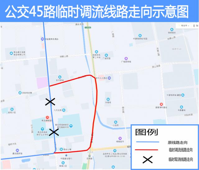 公交 45 路:从珠山路站发班到青岛农村商业银行水灵山路站后,通过双珠路、大珠山中路、灵山湾路、水灵山路到达隆泰国际站后恢复原线运行;返程调流线路相同。