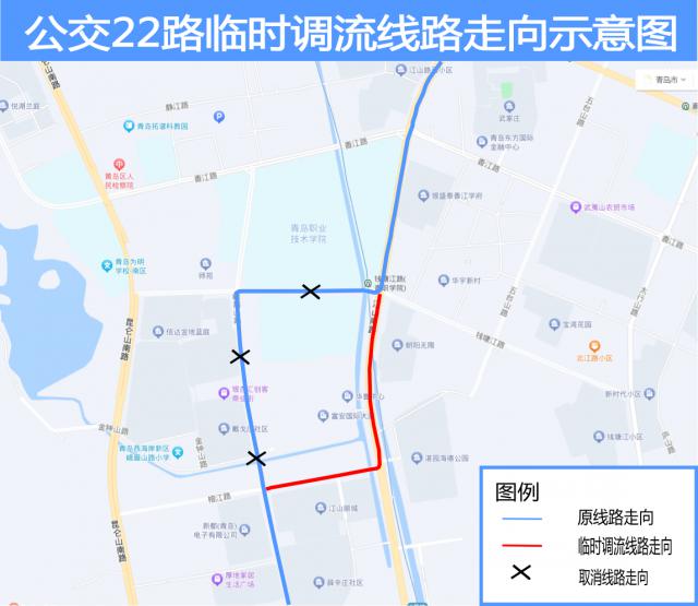 公交 22 路:经峨眉山路、榕江路、江山南路、钱塘江路到达钱塘江路五台山路站后,观海华庭站发班按原线路运行至江山丽城站后,恢复原线路运行;返程调流线路相同。