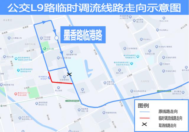 公交 L9 路:理工大学新校区站按原线路运行至胶南一中南站后,通过墨香路、云海路、水城路、临港路、墨香路到达墨香路临港路;墨香路临港路返程通过墨香路、灵海路、水城路、云海路、墨香路到达胶南一中南站后,恢复原线路运行。