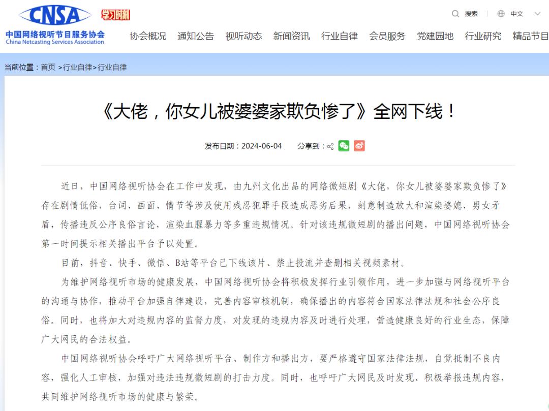 近日,中国网络视听协会在工作中发现,九州文化出品的网络短剧《老大哥,你女儿被婆婆家欺负惨了》剧情低俗,涉及使用残酷犯罪手段的台词、画面、情节等造成不良后果,刻意制造放大、渲染婆媳、男女分歧、传播违反公序良俗言论、渲染血腥暴力等诸多违法行为。中国网络视听协会首次提醒相关播出平台处理这一违规微短剧的播出问题。