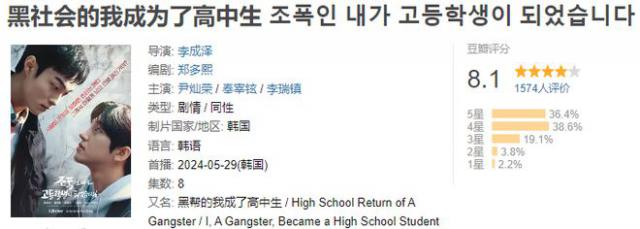 《黑社会的我成了高中生》在豆瓣平台上的最新评分分为 8.1 分数,四星好评占比最高,约为 五星好评占比约为38%。 36%。