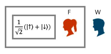 这个思想实验可以看作是薛定谔猫思想实验的升级版,只是用一个与外界完全隔离的实验室代替了装猫的盒子,用一个精通物理知识的实验科学家代替了那只愚蠢的猫。让我们用它 F 来代表这位科学家;在实验室之外,还有一位不动手的理论物理学家,我们用它。 W 来代表。