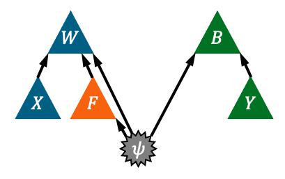 • P ( WB|XY ) = ∑ FP ( WFB|XY ) ,即遍历全部 F 的 Ψ → F → W 因果联系的总和应该等于 Ψ → W 因果连接;
