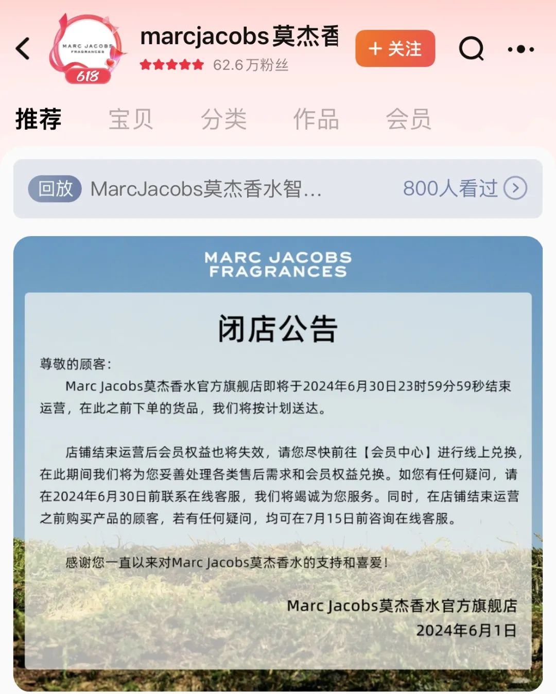 近日,Marc Jacobs莫杰香水官方天猫旗舰店发布关闭公告,宣布运营将于6月30日结束,关闭前下单的商品将按计划发货,售后截止时间为2024年7月15日。