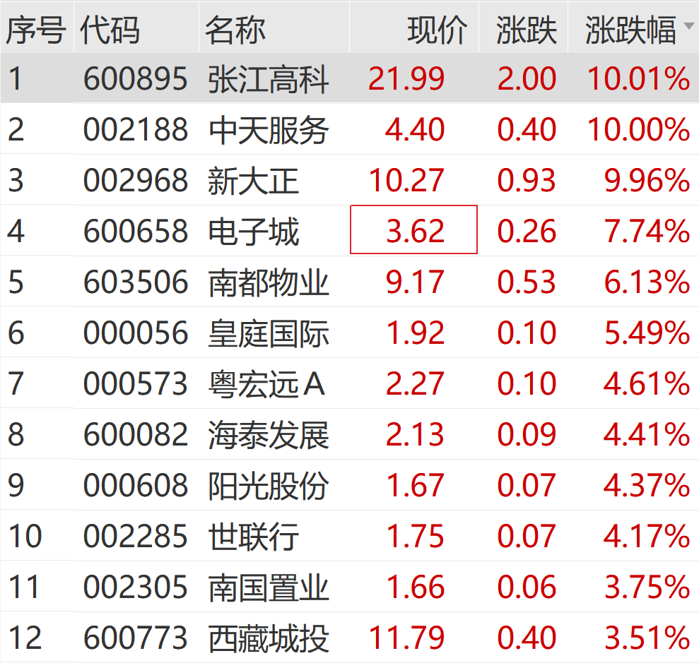 此外,上午房地产股持续活跃,张江高新、中天服务、新大正等。都封了日线涨停,皇庭国际、电子城、阳光股份等涨幅居前。