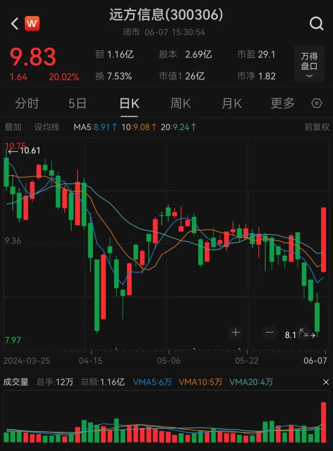 此前股价持续下跌的远方信息今日高开后“闪电”涨停20CM,最新市值约26亿元。