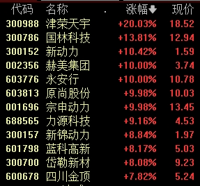 氢能概念股也是如此 津荣天宇20CM涨停大幅上涨。